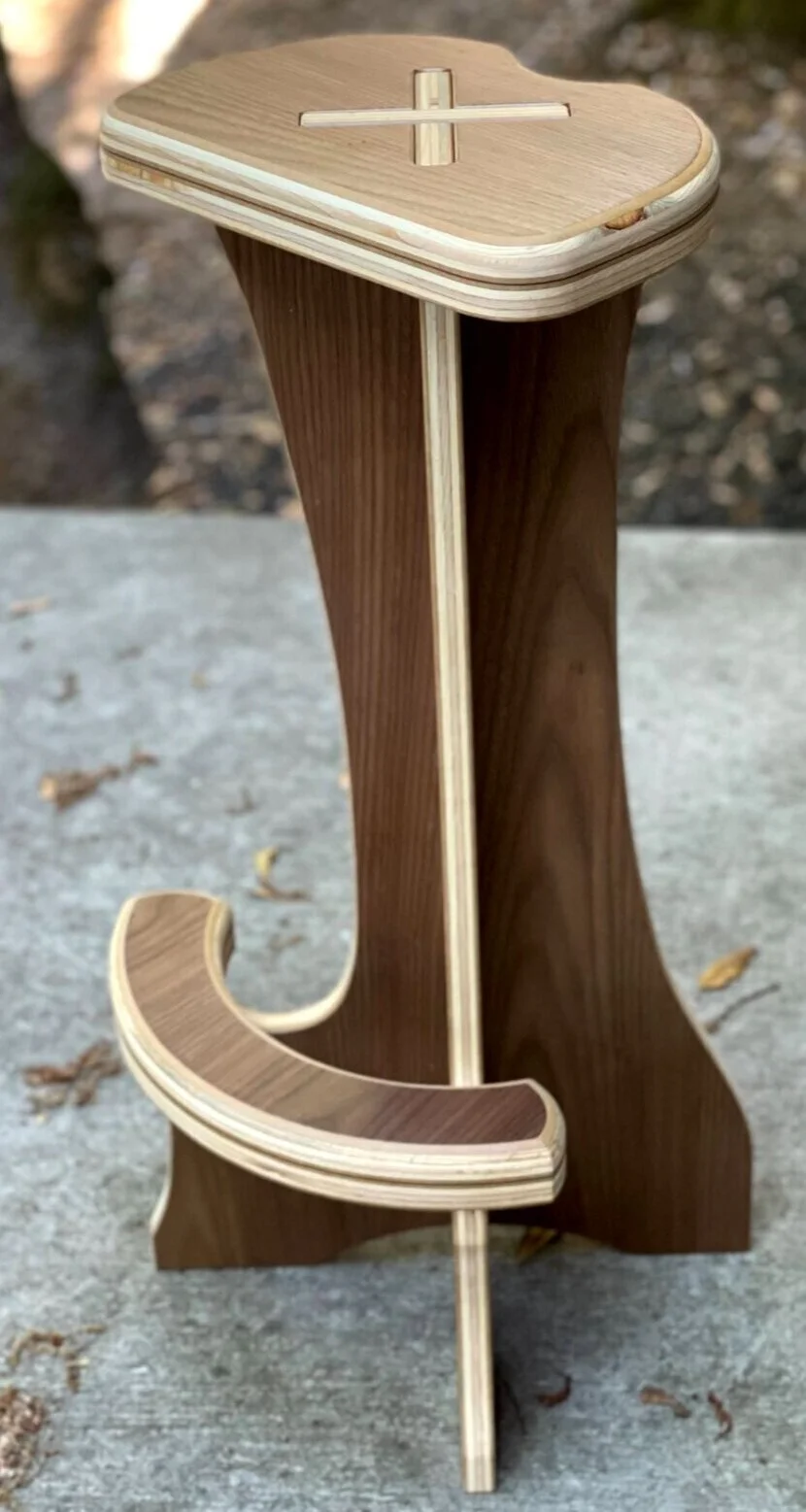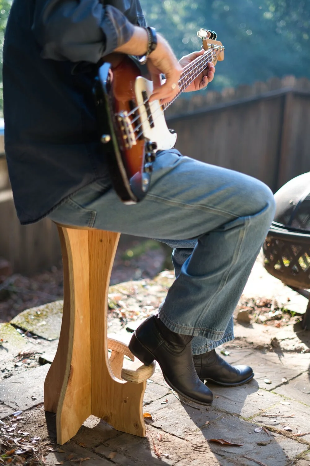 The stool is now available with a notch in the seat! This can be used to keep your guitar from falling over when you stand up. Simply indicate in your order that you want the seat notch and your stool will come with a smooth notch that will hold your guitar up without causing damage.